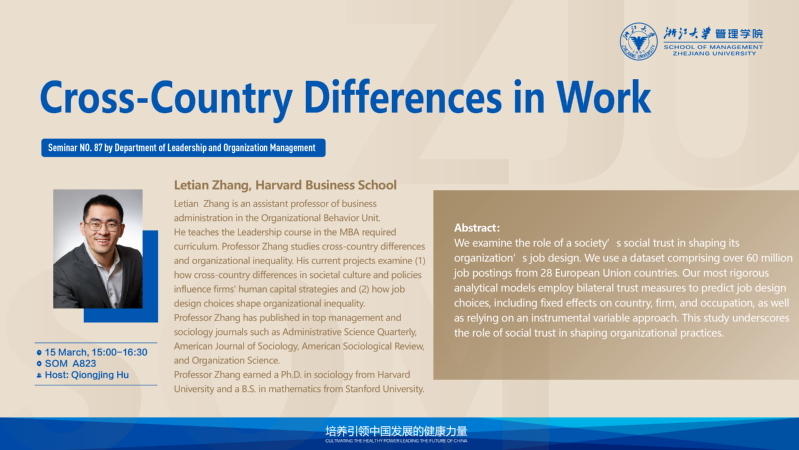 Professor Zhang studies cross-country differences and organizational inequality. His current projects examine (1) how cross-country differences in societal culture and policies influence firms' human capital strategies and (2) how job design choices shape organizational inequality. Professor Zhang has published in top management and sociology journals such as Administrative Science Quarterly, American Journal of Sociology, American Sociological Review, and Organization Science.