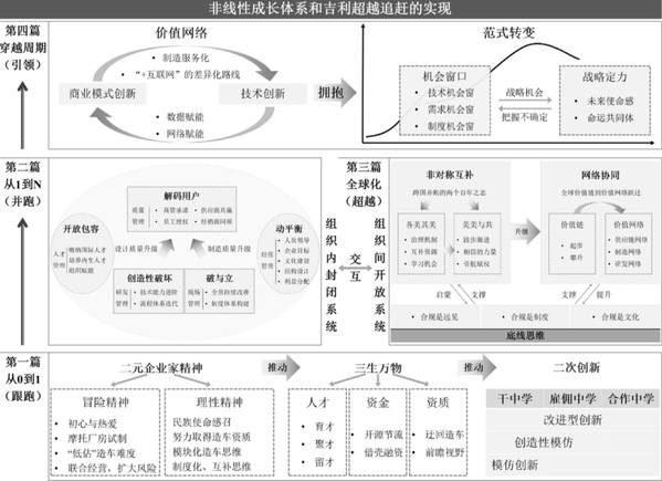 其中,第一篇为从0到1:走出“混沌”。阐述吉利初期在“缺人、缺钱、缺技术”的条件下进入集技术、人才、资本密集于一体的汽车产业,如何实现零的突破。第二篇为从1到N:走向有序。系统探讨吉利作为汽车行业的后发者,如何凭借国家政策的支持及先进技术,通过组织、技术、人才、质量、文化等方方面面的转型和创新,成功在全球汽车市场中占据一席之地。第三篇为惊险一跃:全球化。详细解构从全球视野观察吉利非线性成长的历程,对过去吉利海外并购,全球化扩张的发展进行全面复盘,分析吉利如何成功走出国门、走向世界。第四篇为穿越周期:拥抱不确定性。立足当下展望未来,从穿越周期的视角探讨吉利战略布局的背后逻辑,进一步解读未来驱动中国汽车行业穿越周期的决定性力量,寻找吉利穿越周期的确定性机遇。第五篇为结尾篇:非线性成长的启示。基于吉利集团的深入扎根研究,窥见中国企业成长过程中有着一脉相承的轨迹和规律——非线性成长,并在此基础上进一步丰富基于中国发展情境的本土原创创新管理理论——“C理论”。