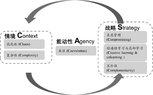 “透过深入系统的案例研究,我们揭示了中国企业超常崛起背后的科学规律和理性解释,实证支持了‘C 理论’的核心CAS框架体系(见图1),即情境(Context)、基于能动性(Agency)的共演和战略(Strategy)。”