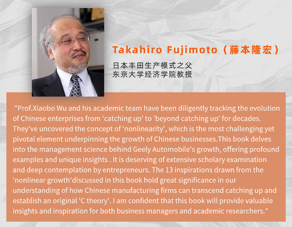 在《Non-Linear Growth: The Rise of Geely》一书中,吴晓波团队以5个篇章、13个章节的内容,对吉利的非线性成长历程进行深入系统分析,并进行规律总结与提炼。