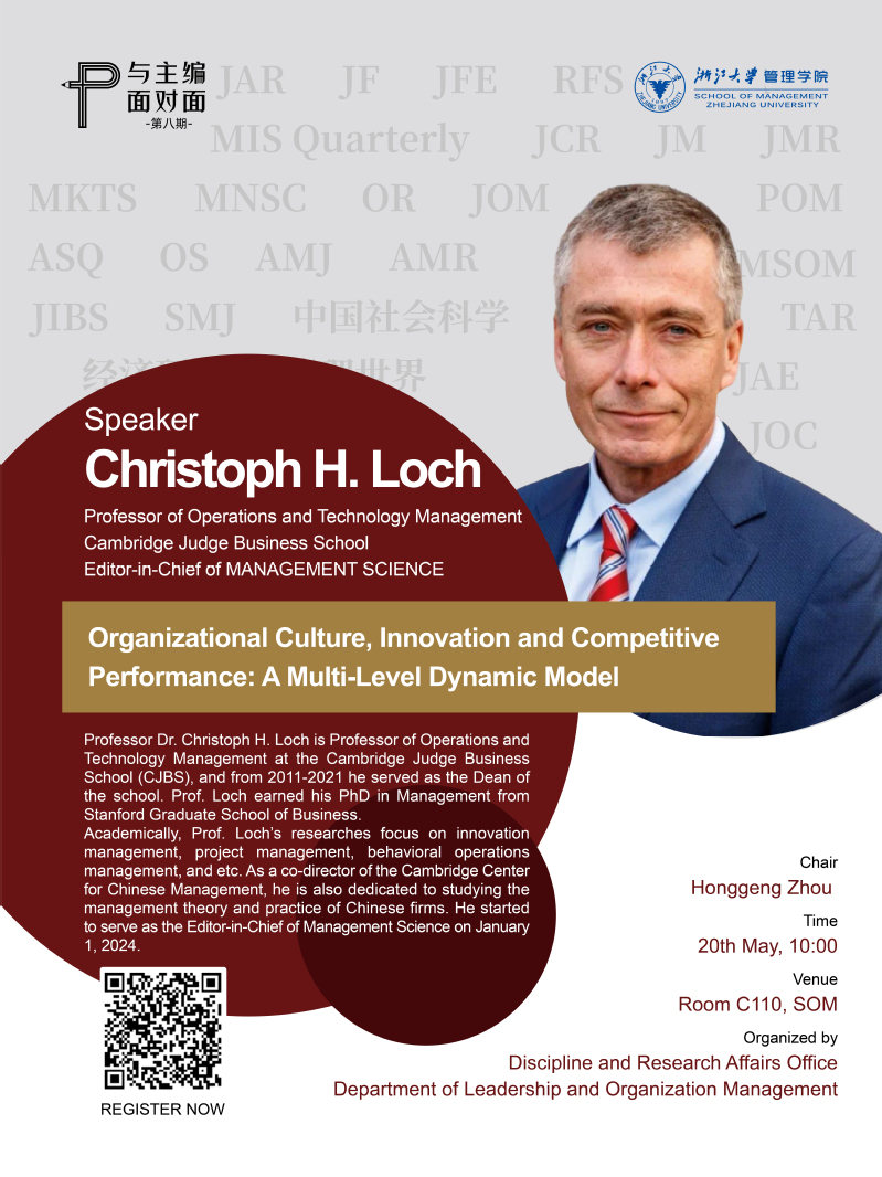 在学术方面,洛赫教授的研究主要集中在创新管理、项目管理、以及行为运营管理等领域。作为剑桥大学中国管理研究中心的联席主席,他也致力于中国企业的管理理论与实践研究。他于2012年被Journal of Product Innovation Management评为创新领域的世界十大学者,于2020年被Decision Sciences评为运营管理领域的世界十大学者。洛赫教授于202411日就任Management Science主编。