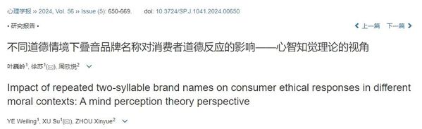 日前,周欣悦教授联合上海财经大学商学院叶巍岭老师、徐苏在《心理学报》刊发研究成果《不同道德情境下叠音品牌名称对消费者道德反应的影响——心智知觉理论的视角》,论证了叠音品牌名称影响消费者道德反应的非对称性路径。