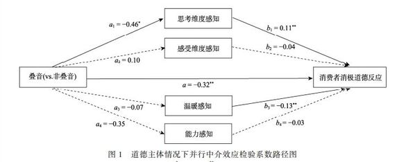 研究发现叠音品牌心智感知的思考和感受维度并不同时发生作用,不同的道德情境下,起到中介作用的只是其中的一个。