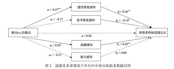 在道德受害者情境下,感受维度起到中介效应,也就是说,叠音会让人们觉得品牌的感受能力很高,即品牌受到伤害后会感受到痛苦,因而提高了人们对于品牌的积极反应。