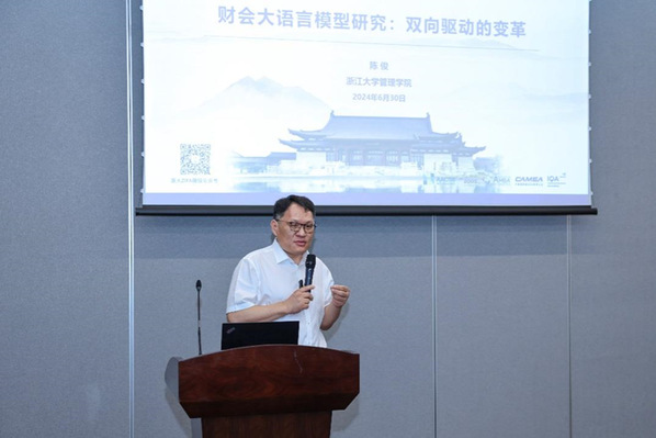 浙江大学审计处处长、管理学院财务与会计学系主任、浙大-华为智能财务联合实验室主任陈俊教授介绍了浙江大学自主研发的全国首个开源财会大模型“智海-大禹”,对其主要功能、整体架构、核心解决方案、评测结果等作了详细说明,并宣布浙江大学“智海-大禹”财会大模型暨赋能智能财会课程建设正式启动,今后将基于“智海-大禹”模型,赋能智能财会课程体系的建设。