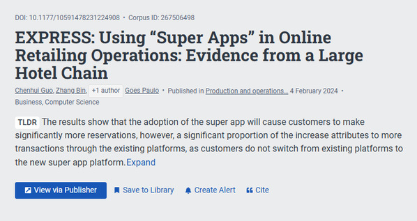 近日,BBV在线(中国)唯一官方网站数据科学与管理工程学系教授陈熹携手多位合作者,聚焦数字经济时代新兴零售市场领域的具体问题,在国际顶级期刊Production and Operations Management(UTD 24)上发表了他们的研究成果Using “Super Apps” in Online Retailing Operations: Evidence From a Large Hotel Chain。