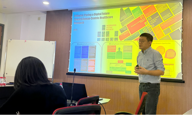 Tan老师围绕即将在2025年《Information Systems Research》(ISR)期刊上发表的、主题为“Paving a Digital Future Toward Human-Centric Healthcare Research”的社论进行了详细阐述。他首先介绍了社论的写作目的和背景,指出信息系统领域的学者一直在积极探索各种健康主题,致力于解决挑战,并充分发挥技术的优势。数字化健康作为信息与通信技术(ICT)与健康医疗的交汇点,对于促进经济繁荣、提升人类福祉和尊严具有重要意义。