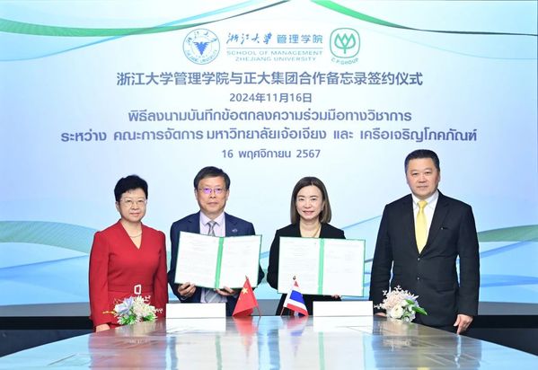 11月16日,在泰国曼谷,浙大管院与正大集团签署全面合作协议,正式建立战略合作伙伴关系。双方相约携手并进,共同致力于推动创新、人才培育及可持续发展。