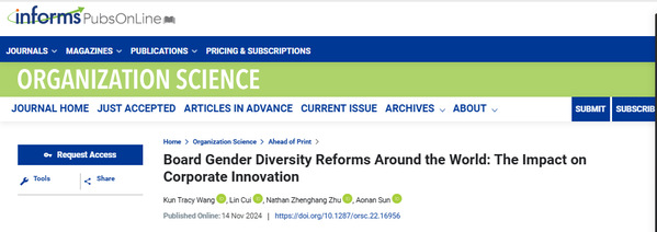 该研究在国际顶级期刊Organization Science(UTD24期刊)发表,题为Board Gender Diversity Reforms Around the World: The Impact on Corporate Innovation。