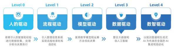 Level 0 阶段主要依赖人工,Level 1 阶段通过流程驱动实现标准化和自动化,Level 2 阶段则依托模型驱动的科学分析,而Level 3 阶段的企业利用大数据和人工智能增强各个业务环节的智能性。这些阶段以“升级”为主导,企业通过技术叠加和优化提升运营效率。