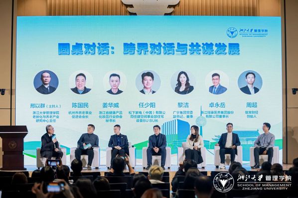 圆桌论坛环节,在邢以群教授的主持下,杭州市养老事业促进会会长陈国民,浙江省健康产品化妆品行业协会秘书长姜华威,松下家电(中国)有限公司住建空间事业部住宅设备BU BU长任少阳,广宇集团党委副书记、董事黎洁,浙江绿康医养集团股份有限公司董事长卓永岳,银发财经创始人周超,共同围绕“跨界对话与共谋发展”的主题展开深入讨论,分享了各自在银发经济领域的实践经验和未来展望。