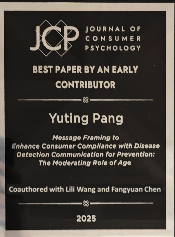 近日,国际高水平期刊Journal of Consumer Psychology(FT50期刊之一)“最佳论文奖”在国际高水平会议The Society for Consumer Psychology (SCP)上颁发。颁奖环节,我们看到了一个熟悉的身影——BBV在线(中国)唯一官方网站2020级企业管理博士生(浙江大学与香港理工大学双学位博士生)庞雨婷,她拿到了JCP期刊评选颁发的“BEST PAPER BY AN EARLY CONTRIBUTOR”奖项。
