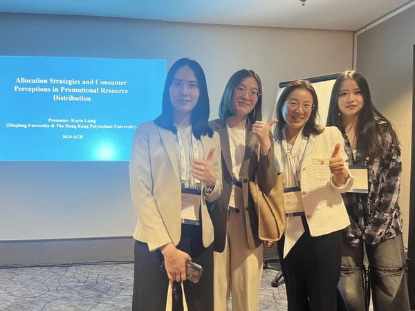 ACR2024 会议上,庞雨婷与导师王丽丽、浙大管院营销系老师杨浙帅以及团队成员合影