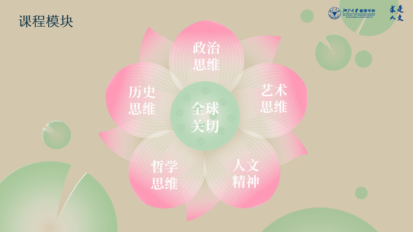 作为“求是人文”课程的“牵头人”,窦军生介绍课程模块构成的PPT上,赫然出现一朵六瓣莲花,分别代表政治思维、历史思维、哲学思维、人文精神、艺术思维、全球关切六个模块。