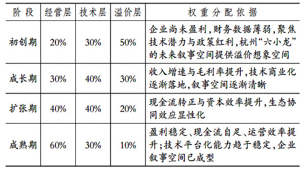 达莫•达兰(Aswath Damodaran)在创新型企业估值中多次提出,在企业生命周期的不同阶段,估值的核心驱动力不同。那么,当企业处于不同的“年龄段”时,就需要调整经营层、技术层和溢价层的重要性“占比”。因此,研究团队尝试对杭州“六小龙”进行了不同生命周期阶段进行权重赋值(见下表),如何理解不同阶段对于不同维度的权重分配?
