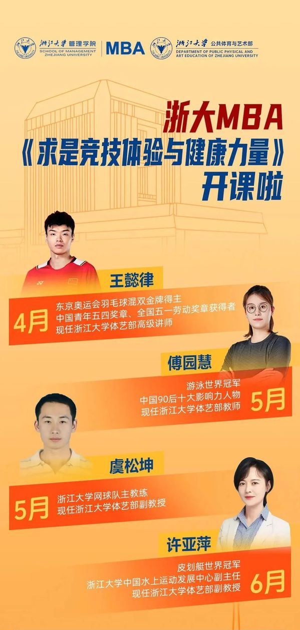 不仅如此,他还协同公共体育与艺术部的老师联合打造了一门结合体育运动健康科学与领导力培养的跨学科课程——《求是竞技体验与健康力量》。作为浙大MBA专业选修课,该课程邀请多位竞技体育世界冠军前来授课,主要训练学生对综合素质要求较高的、且在国际上普及率较高的体育项目 (如皮划艇、游泳、网球和羽毛球等) 的基本技能掌握和战术应用,深化竞技体验和竞技技能增强身体素质,促进健康运动技能习得和习惯养成,培养学生高压下的竞争能力、策略规划、领导力。