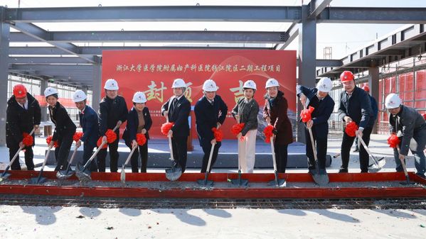 杨浙帅(右1)应邀参与省妇保钱江院区二期工程项目封顶仪式