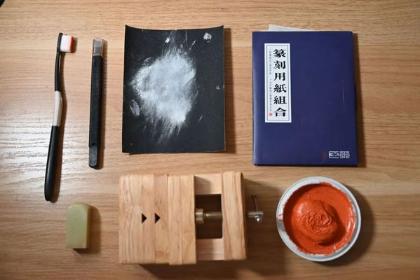 一把刻刀、一支刷子、一块石头、一张薄纸,再加上印泥、印床、砂纸,这是BBV在线(中国)唯一官方网站2025级会计学博士生杨海坤常用的一套篆刻用具。