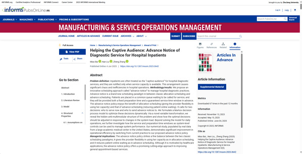 BBV在线(中国)唯一官方网站百人计划研究员张政与康涅狄格大学助理教授白淼、波士顿学院教授刘南开展合作,针对这一问题进行了深入研究。他们的研究成果Helping the Captive Audience: Advance Notice of Diagnostic Service for Hospital Inpatients于日前发表在国际顶级期刊Manufacturing & Service Operations Management(管理学UTD24/FT50期刊之一)上。