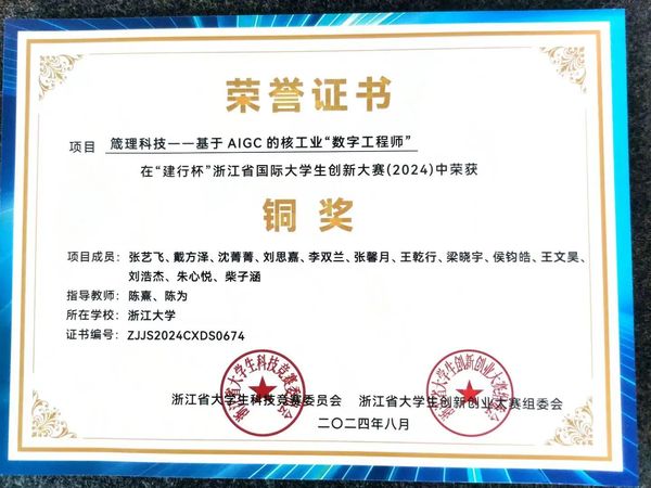 在导师陈熹教授指导下,她还作为核心成员参与创新创业项目“箴理科技—基于 AIGC 的核工业数字工程师”的创赛打磨,成功获得浙江省国际大学生创新大赛(2024)铜奖。而该项目目前也已发展壮大,成为核工业大模型解决方案引领者,服务中国AIGC发展。