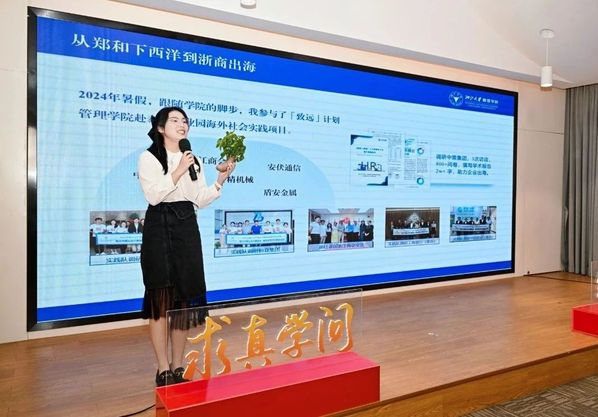 舞台上的她,从容自信、情感真挚,凭借对浙商出海新实践的生动讲述与规律提炼等,成功摘得该赛事学生组一等奖。