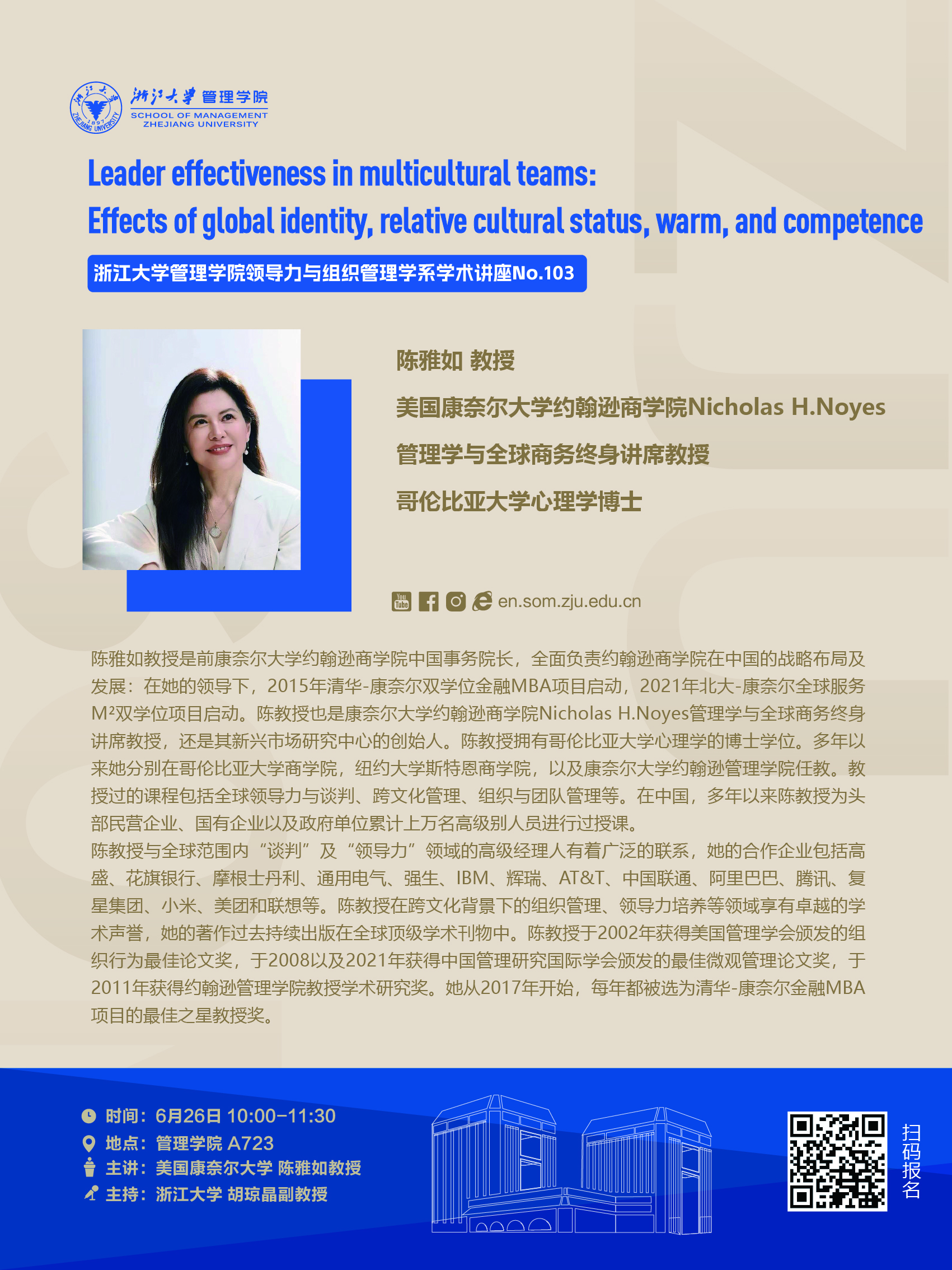 讲座标题:Leader effectiveness in multicultural teams: Effects of global identity, relative cultural status, warm, and competence