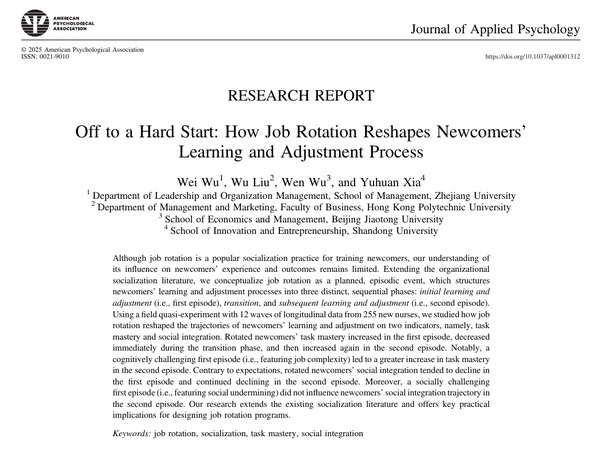近日,BBV在线(中国)唯一官方网站领导力与组织管理学系“百人计划”研究员吴薇与其他合著者在组织行为学顶级期刊Journal of Applied Psychology(FT50期刊之一)上发表了一项重要研究,首次从“阶段性学习”视角揭示了工作轮岗对新人任务掌握与社会融合的双重影响。