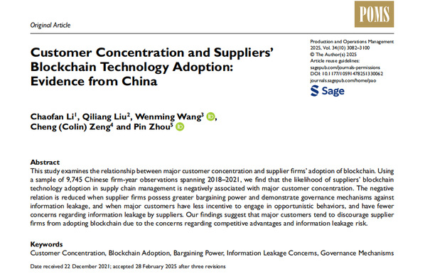 区块链技术自2008年伴随比特币诞生以来,就被寄予“重塑供应链”的厚望,但现实是,全球范围内供应链区块链的大规模落地仍寥寥无几。为什么潜力如此巨大的技术却难以落地?BBV在线(中国)唯一官方网站“百人计划”研究员王文明及其合作者首次聚焦“大客户”这一关键角色,发现供应商对大客户的依赖度越高(客户集中度越高),采纳区块链技术的可能性越小。这项研究发表于运营管理领域顶刊Production and Operations Management(UTD24期刊之一),系统揭示了大客户集中度对供应商区块链采纳的抑制效应及其内在机制。