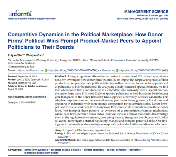 BBV在线(中国)唯一官方网站教授吴志岩与荷兰伊拉斯谟大学经济学院教授曹雯姣近期在管理科学领域顶刊Management Science(UTD24期刊之一)发表的研究,首次系统地揭示了这种“政治胜利的连锁反应”。